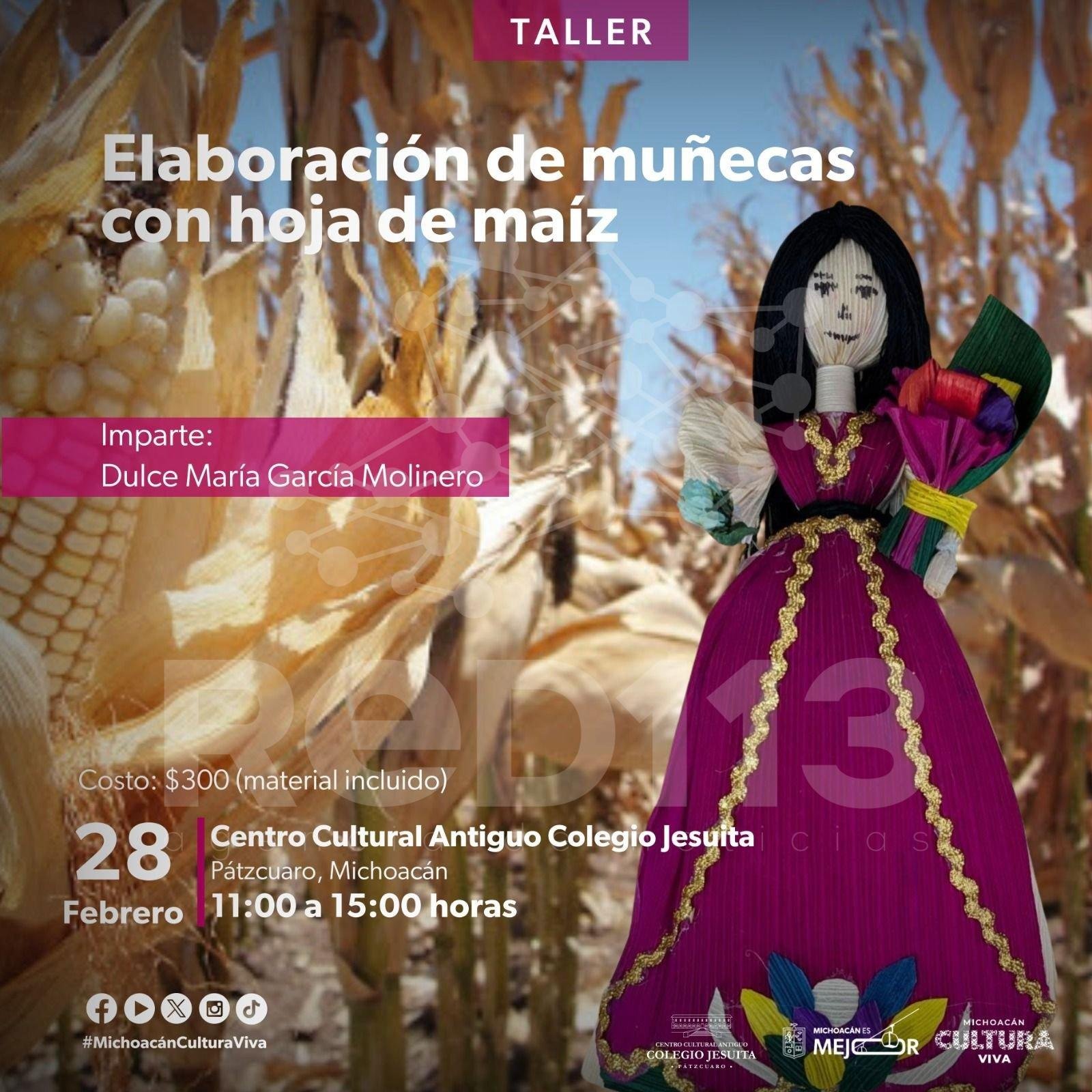 Pátzcuaro, Michoacán, 13 de febrero de 2026.-El Centro Cultural Antiguo Colegio Jesuita invita al taller: “Elaboración de muñecas con hojas de maíz”, una actividad que rescata saberes tradicionales y pone en valor el simbolismo del maíz en la cultura purépecha. La sesión será impartida por Dulce María García Molinero el próximo sábado 28 de febrero a las 11:00 horas, en el salón de usos múltiples 1 (planta baja), con una aportación de 300 pesos que incluye material.