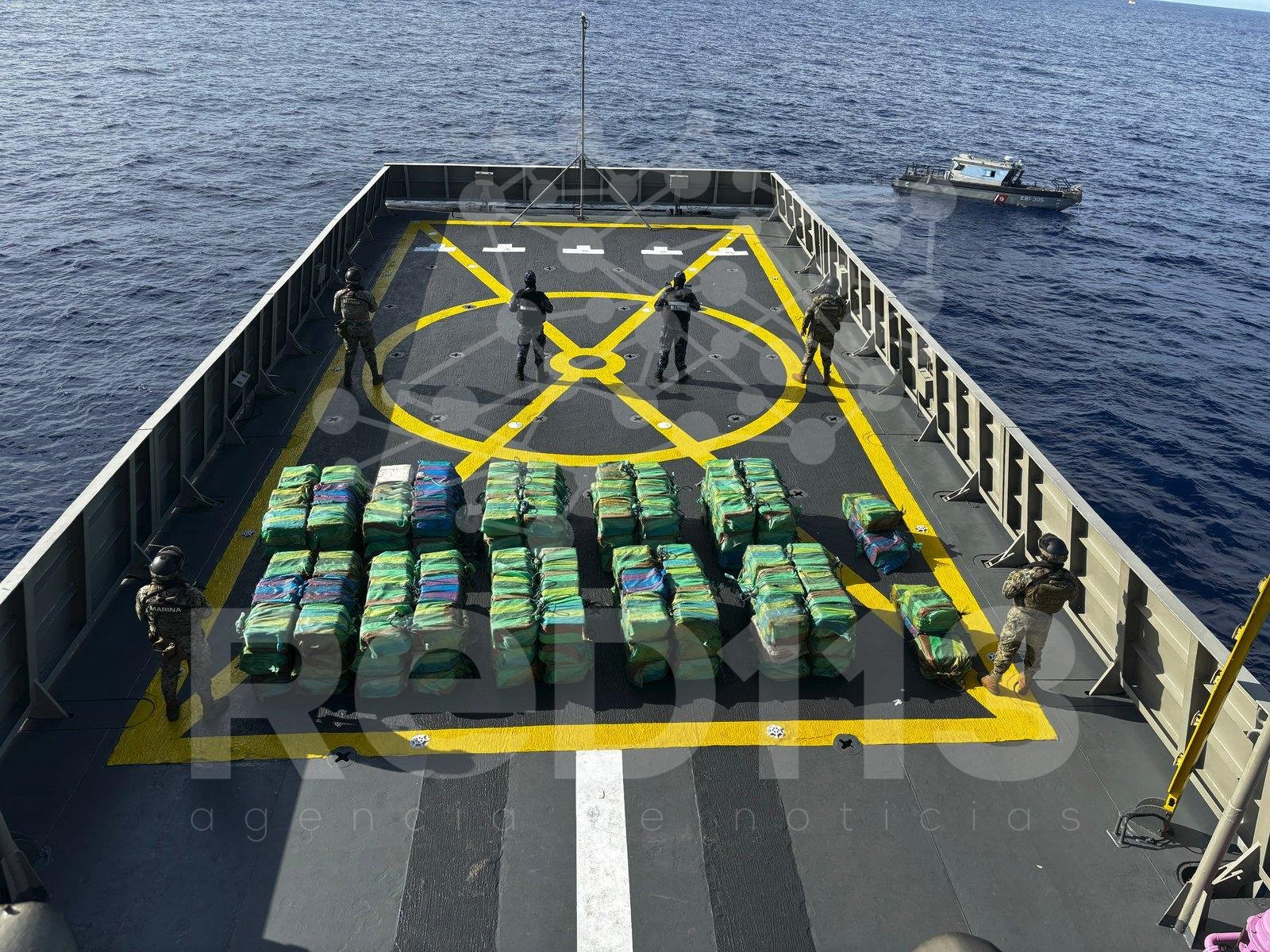 Ciudad de México.- En el marco de las acciones permanentes para mantener el Estado de derecho, la Secretaría de Marina a través de la Armada de México en funciones de Guardia Costera, informa que, durante operaciones de vigilancia y seguridad marítima, se logró el aseguramiento de aproximadamente 188 bultos que representan varias toneladas de presunta cocaína, en espera de que las autoridades competentes determinen el peso ministerial.