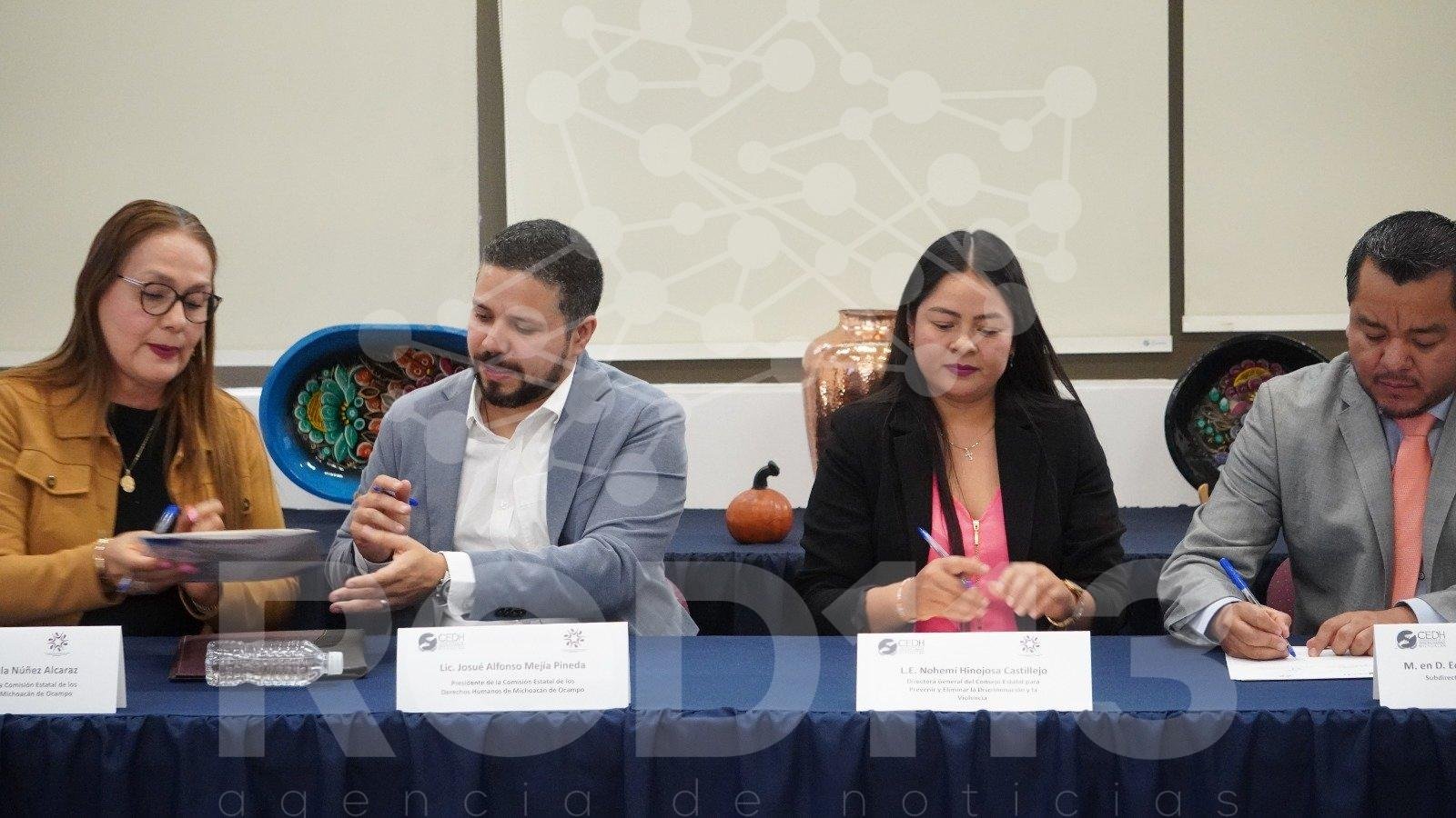 Morelia, Michoacán, 14 de abril de 2026.- Al formalizar el convenio de colaboración entre la Comisión Estatal de los Derechos Humanos de Michoacán (CEDH) y el Consejo Estatal para Prevenir y Eliminar la Discriminación y la Violencia en Michoacán (COEPREDV), que permite que en todas las oficinas de la CEDH se reciban denuncias y quejas por discriminación, el ombudsperson, Josué Mejía, aseguró que “La discriminación es una amenaza que trastoca la dignidad del ser humano”, por lo que en esta nueva etapa del organismo se está trabajando en prevenirla y erradicarla.