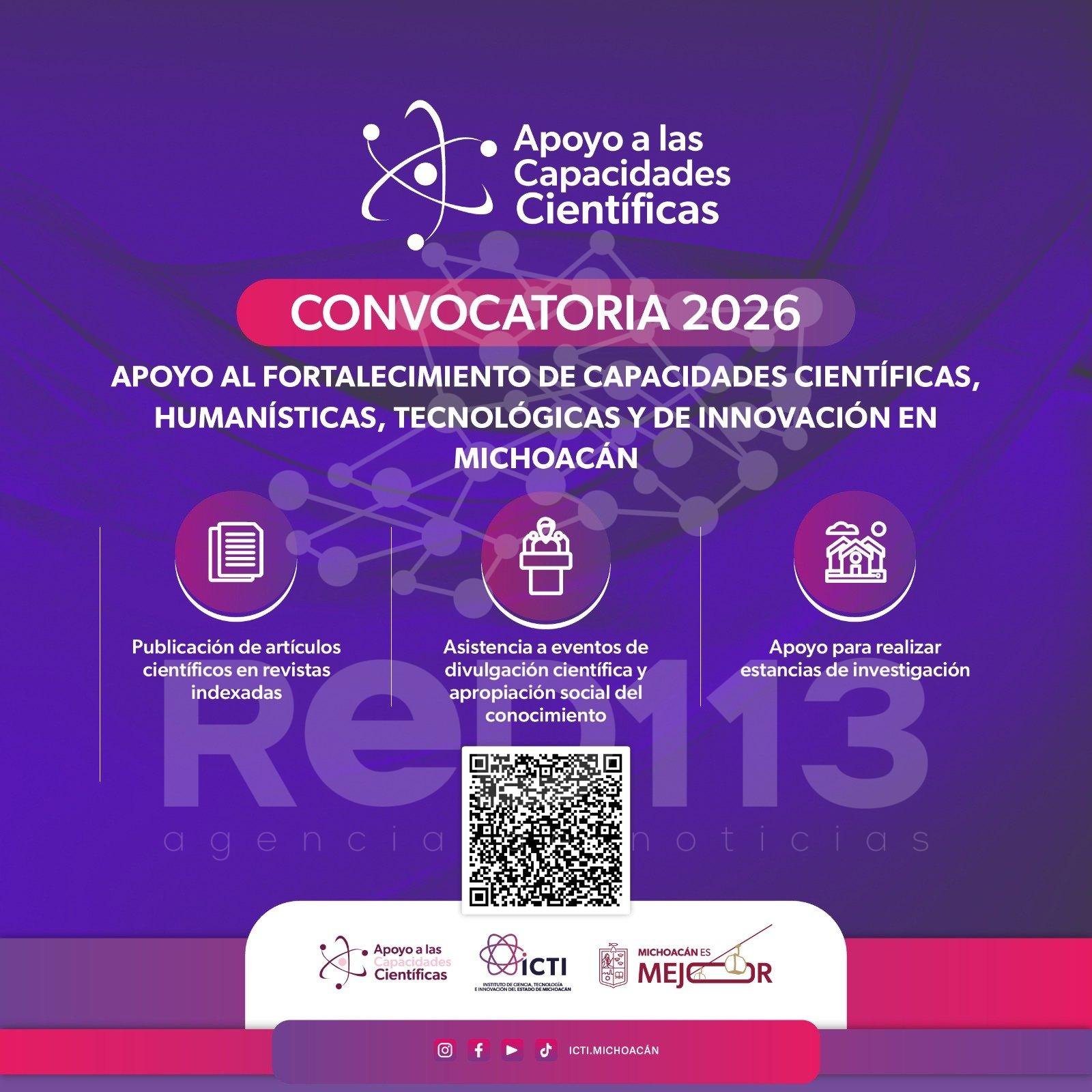 Morelia, Michoacán, 24 de abril de 2026.- El Instituto de Ciencia, Tecnología e Innovación (ICTI) anunció la apertura de la convocatoria “Apoyo para el Fortalecimiento de las Capacidades Científicas, Humanísticas, Tecnológicas y de Innovación en Michoacán”, dirigida a impulsar la participación de la comunidad académica y científica en actividades de divulgación y formación.