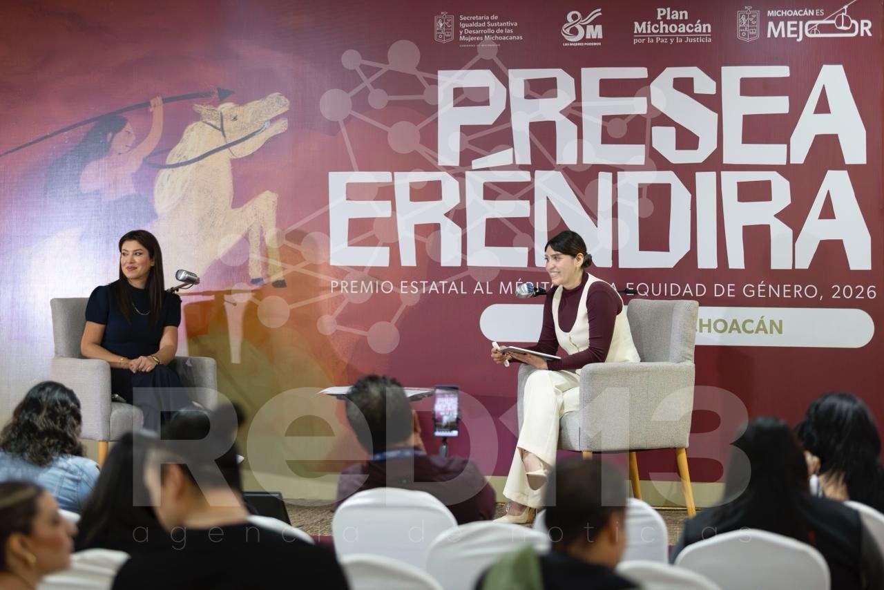 Morelia, Michoacán, 10 de febrero de 2026.- La titular de la Secretaría de Igualdad Sustantiva y Desarrollo de las Mujeres Michoacanas (Seimujer), Alejandra Anguiano González, presentó la convocatoria del Premio Estatal al Mérito de la Equidad de Género “Presea Eréndira”. Durante el acto, hizo un llamado especial a postular a niñas y adolescentes que defienden los derechos humanos de las mujeres y las infancias en sus comunidades.