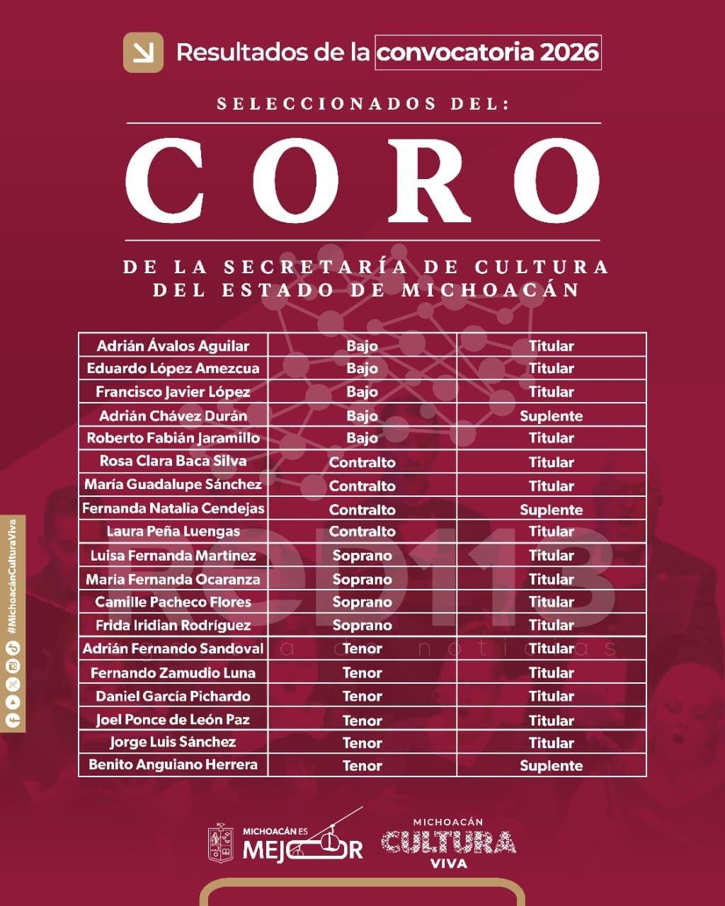 Morelia, Michoacán, 24 de febrero de 2026.- La Secretaría de Cultura de Michoacán (Secum) dio a conocer los resultados de la convocatoria del Coro de la Secum 2026, agrupación que representará al estado durante este año en diversas actividades artísticas y culturales.