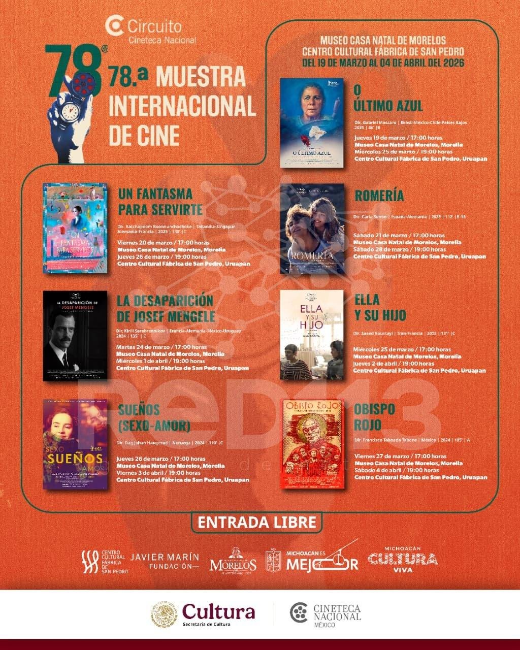 A través del Circuito Cineteca, programa que busca descentralizar el acceso al cine de calidad, la muestra se llevará a cabo del 19 de marzo al 4 de abril de 2026 en el Museo Casa Natal de Morelos, en Morelia, y el Centro Cultural Fábrica de San Pedro, en Uruapan, con funciones abiertas al público.