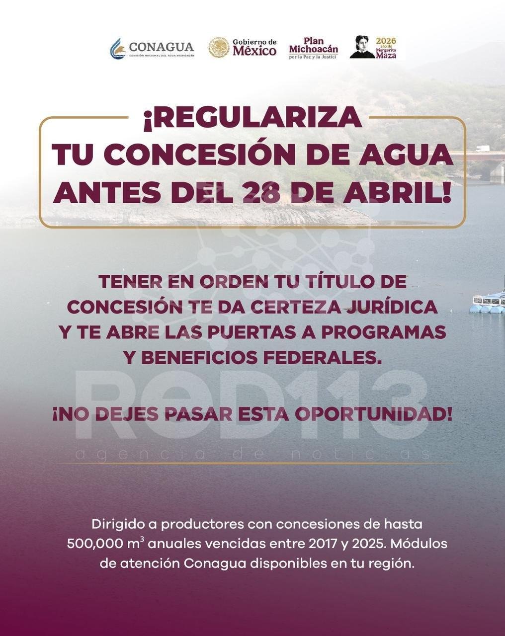 Morelia, Michoacán, 11 de abril de 2026.- La Comisión Nacional del Agua (Conagua) delegación Michoacán invita a las y los productores agrícolas y pecuarios a regularizar su concesión del agua, trámite que se puede hacer hasta el 28 de abril.