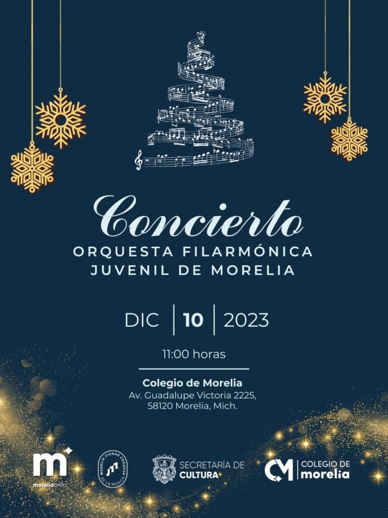 Morelia, Michoacán, 6 de diciembre de 2023.- En el marco de las festividades decembrinas y con el propósito de proporcionar espacios de sano entretenimiento para las familias morelianas, la Secretaría de Cultura, bajo la dirección de Fátima Chávez Alcaraz, recuerda a la comunidad que el próximo domingo 10 de diciembre, la Orquesta Filarmónica Juvenil de Morelia (OFIM) llevará a cabo un Concierto Navideño en el Colegio de Morelia, como parte de las actividades festivas anunciadas por el Presidente Municipal de Morelia, Alfonso Martínez Alcázar.