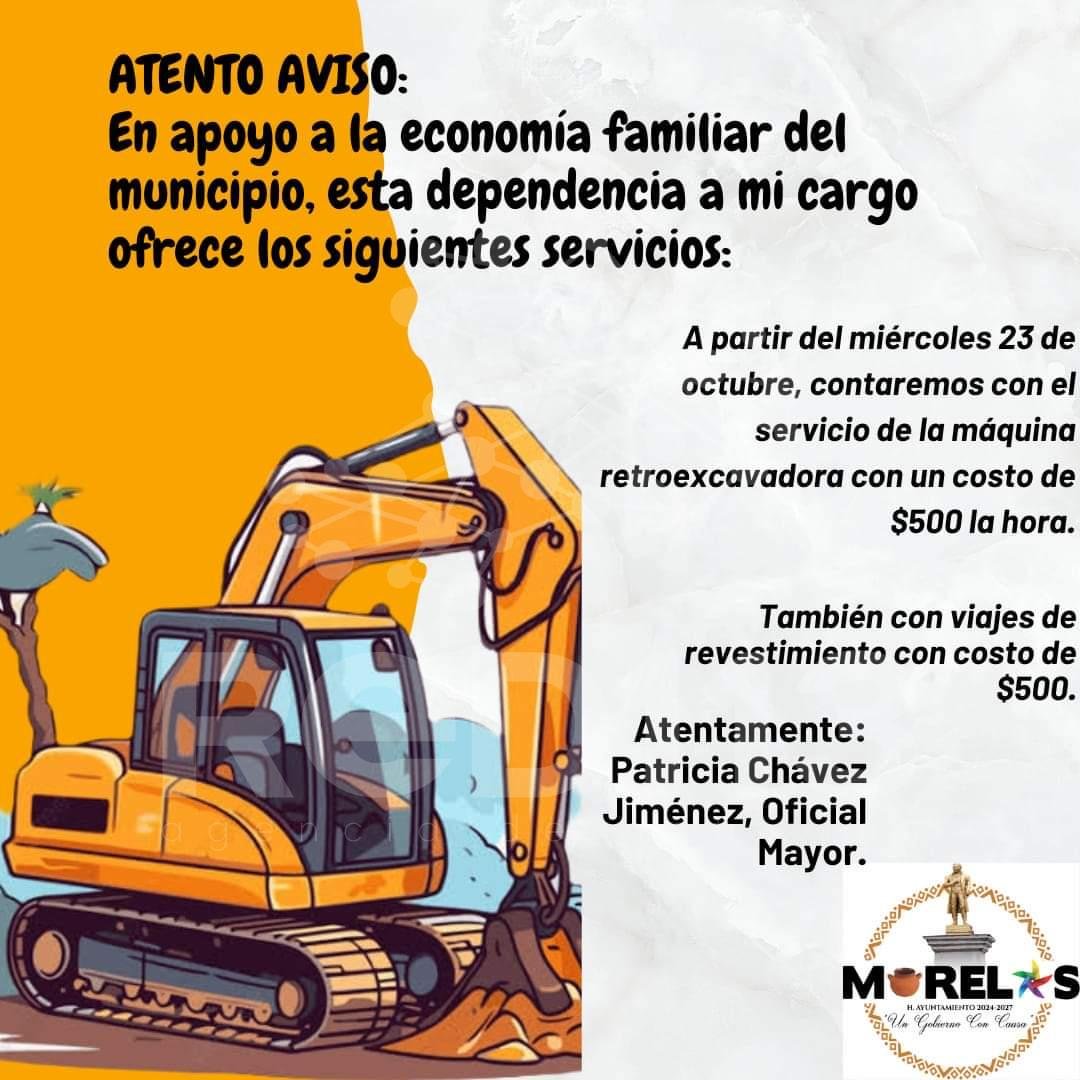 Villa Morelos, Michoacán, a 22 de octubre 2024. – El Ayuntamiento de Morelos, a través de Oficialía Mayor, apoya a las familias del municipio con servicios como la máquina de retroexcavadora y viajes de revestimiento a costos más accesibles, a fin de facilitar el desarrollo comunitario.