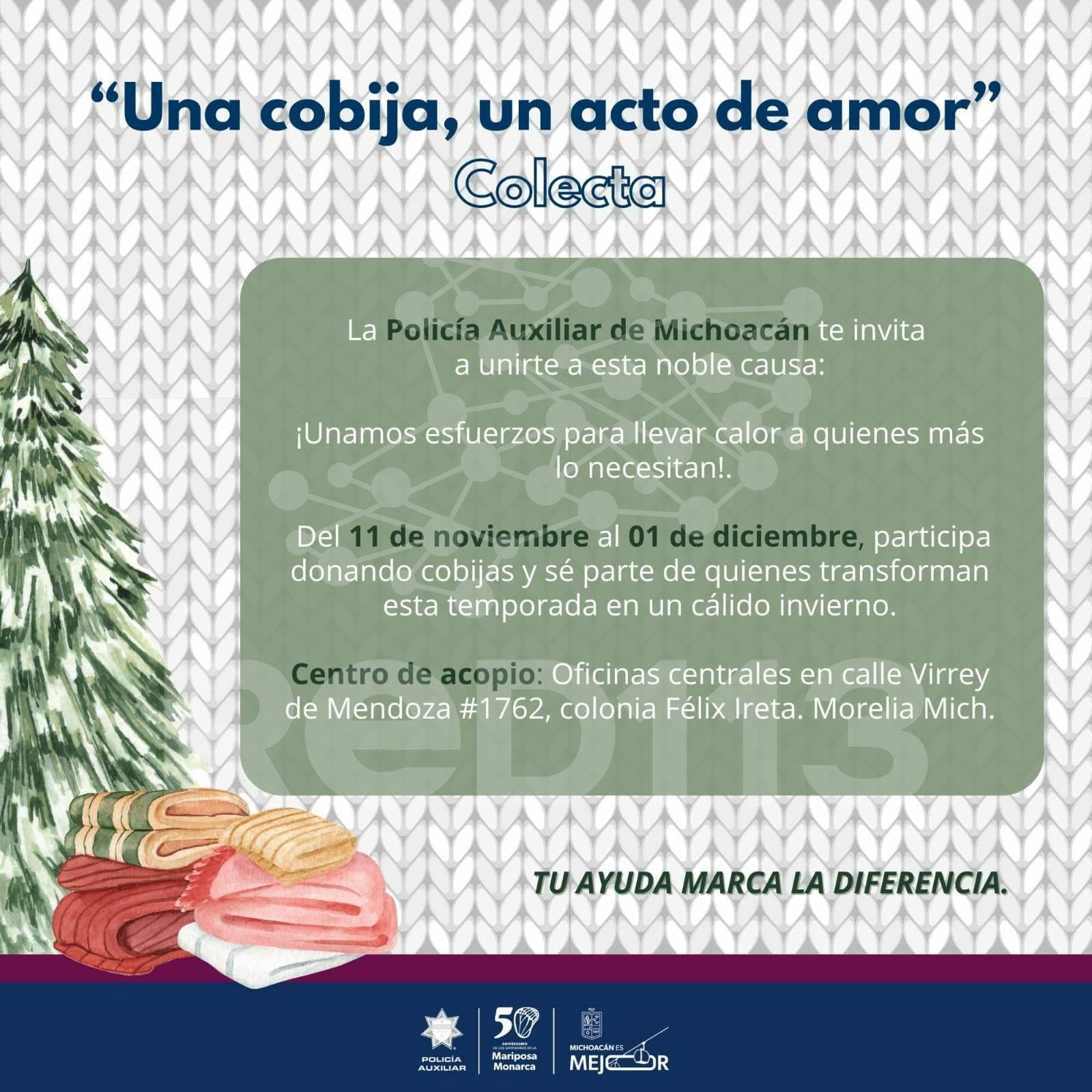 El punto de acopio se habilitó en las oficinas centrales de la Policía Auxiliar, ubicadas en calle Virrey de Mendoza #1762, colonia Félix Ireta, en Morelia, donde se estarán recibiendo cobijas nuevas o en buen estado.