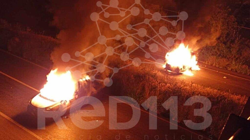 Morelia, Mich.- Domingo 13 de octubre de 2024.- Presuntos normalistas incendiaron tres vehículos en las cercanías de la carretera Morelia-Pátzcuaro, entre ellos una patrulla de la Policía Morelia, hecho que se derivó de una persecución entre policías y aparentes ladrones de un automotor, informaron fuentes allegadas al tema.
