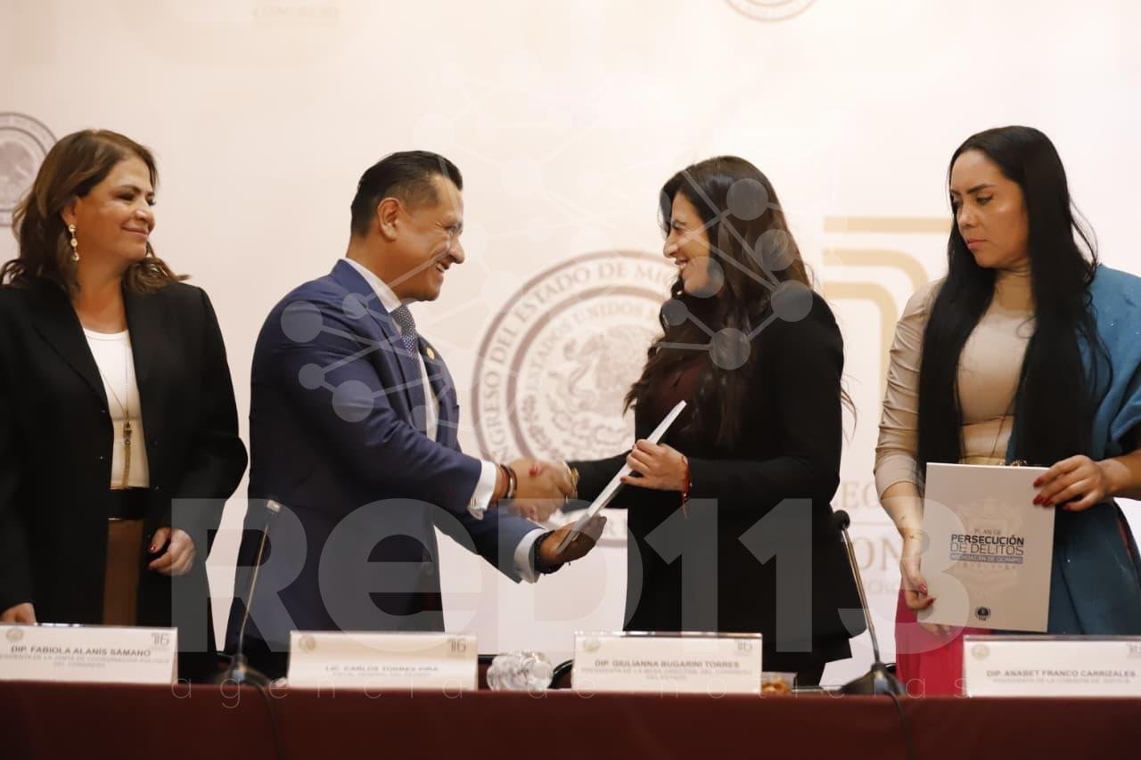 Morelia, Michoacán, a 16 de diciembre de 2025.- Al recibir de manos del Fiscal General del Estado el Plan de Persecución del Delito 2025-2034, la Presidenta de la Mesa Directiva, diputada Giulianna Bugarinni Torres, reiteró la disposición del Poder Legislativo para seguir construyendo un sistema de justicia más fuerte, más moderno y más digno para Michoacán.