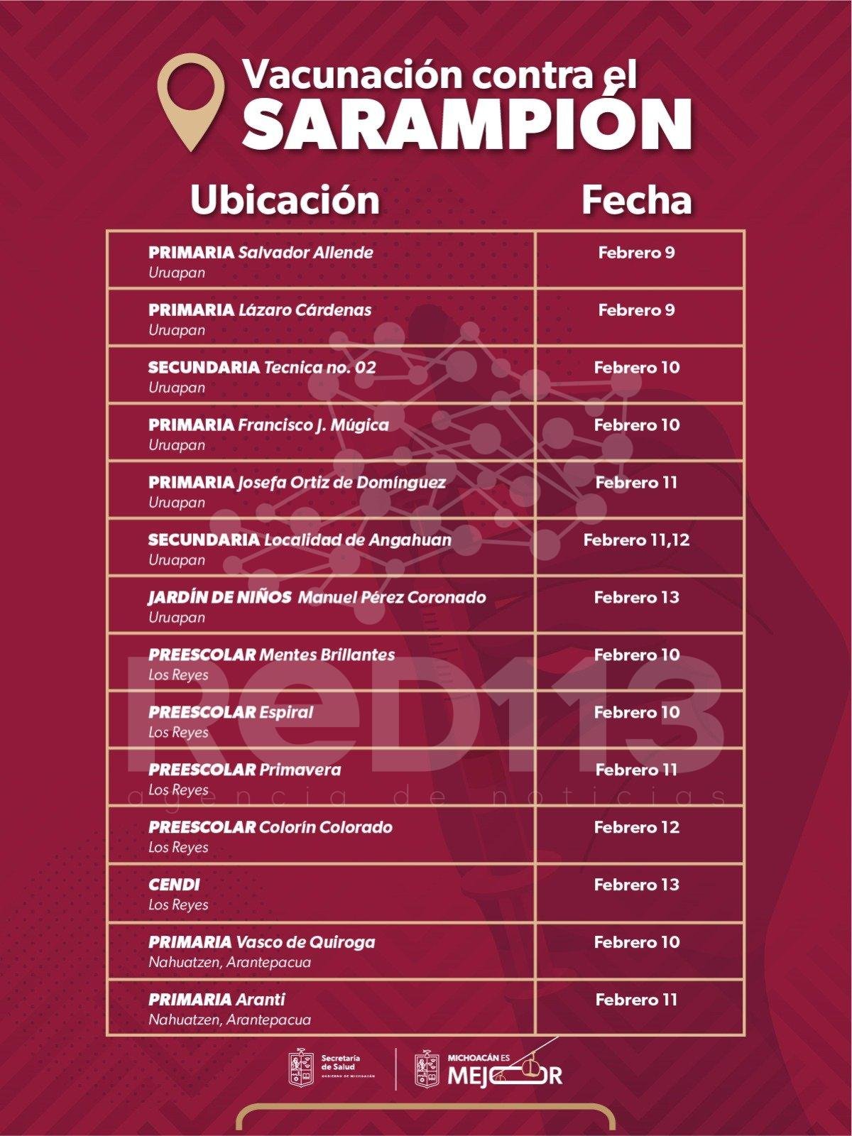En Apatzingán, habrá jornada de vacunación el 10 de febrero en las primarias “1 de mayo” y “Leandro Valle”; el 11 de febrero en la escuela “Mc Gregor” y el Instituto del Valle de Apatzingán; el 12 de febrero en las primarias “Luis Donaldo Colosio” y “Juan de la Barrera”, y finalmente, el 13 en la primaria “Constituyentes de Apatzingán”.