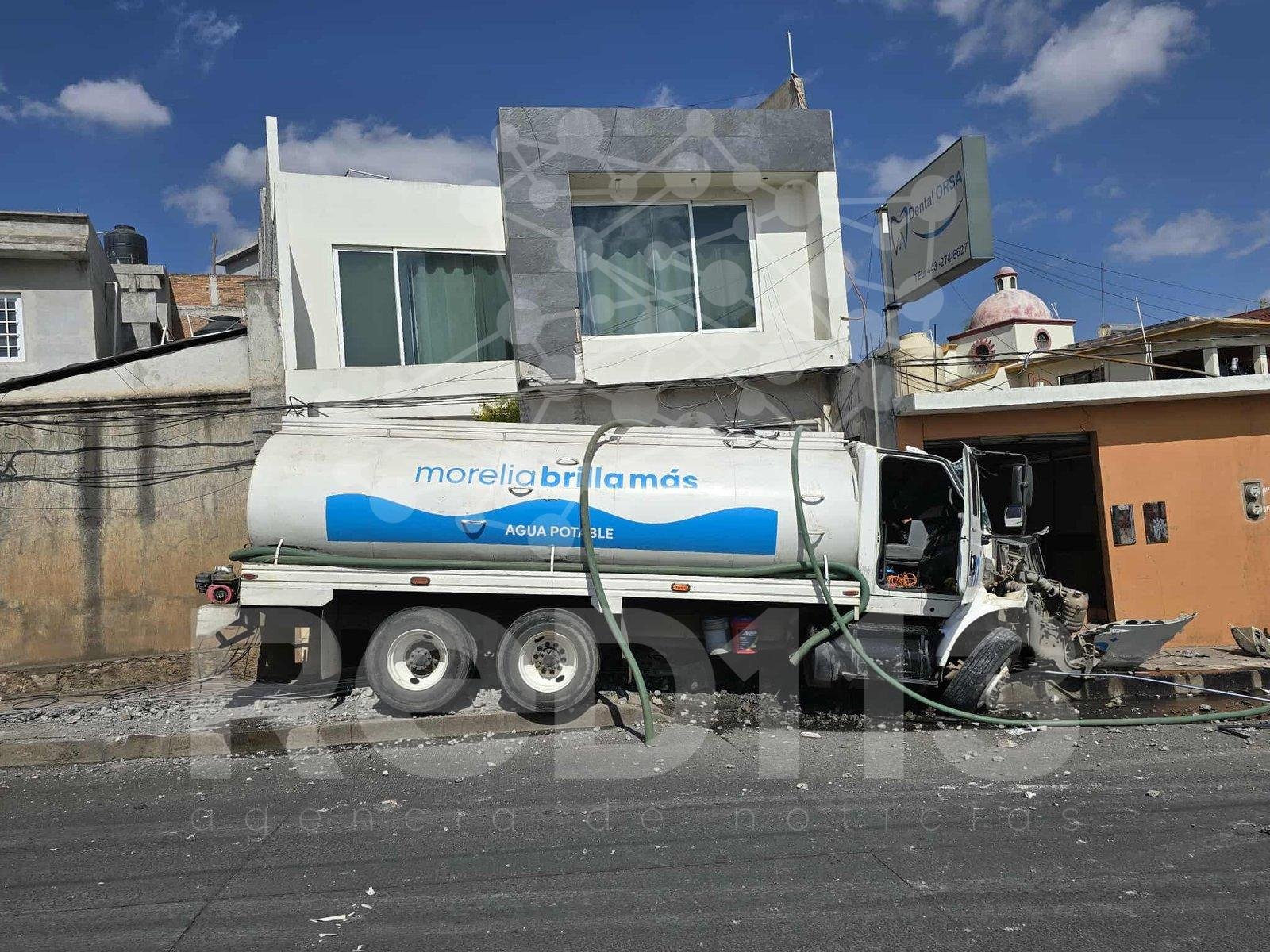 Morelia, Mich.- Lunes 12 de enero de 2026.- Un camión pipa de agua del municipio embistió la retaguardia de una camioneta, derribó un poste de la Comisión Federal de Electricidad (CFE) y terminó estrellado contra la fachada de un consultorio dental y otro domicilio. Presuntamente, al pesado vehículo le fallaron los frenos, lo que originó el percance, el cual por fortuna no dejó lesionados ni fallecidos, informaron autoridades policiales.