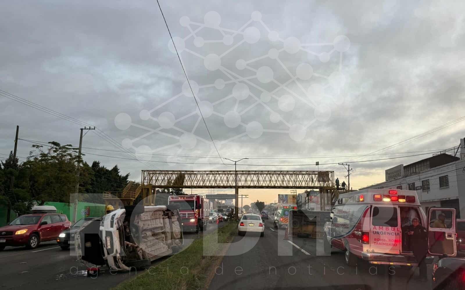 Morelia, Mich.- Lunes 22 de septiembre de 2025.- Una combi y automóvil protagonizaron un accidente y ambos terminaron volcados sobre la Avenida Morelos Norte de Morelia, en la salida a Salamanca, informaron fuentes policiales.