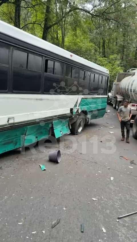 Madero/Acuitzio, Mich.- Martes 24 de junio de 2025.- Un camión de pasajeros y un tráiler pipa doble remolque protagonizaron un choque sobre la carretera Acuitzio-Villa Madero, el cual dejó algunas personas lastimadas y daños materiales, de acuerdo con información preliminar.