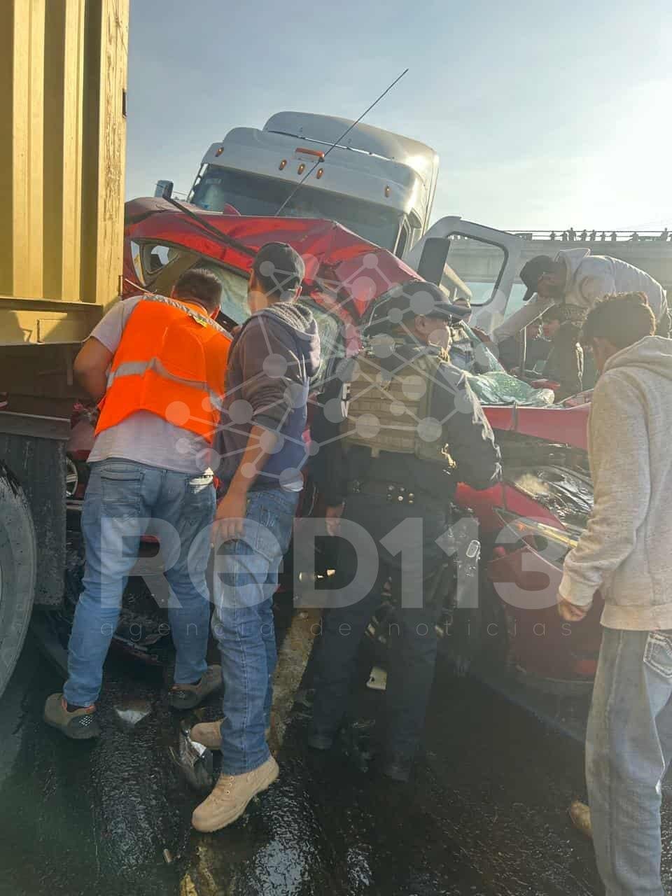 Ziracuaretiro, Mich.- 16 de octubre de 2025.- La mañana de este jueves se registró un choque múltiple, en el que un auto particular terminó aplastado entre dos camiones de carga, con saldo preliminar de varias personas heridas, en la autopista Siglo XXI. A unos kilómetros otro vehículo volcó.