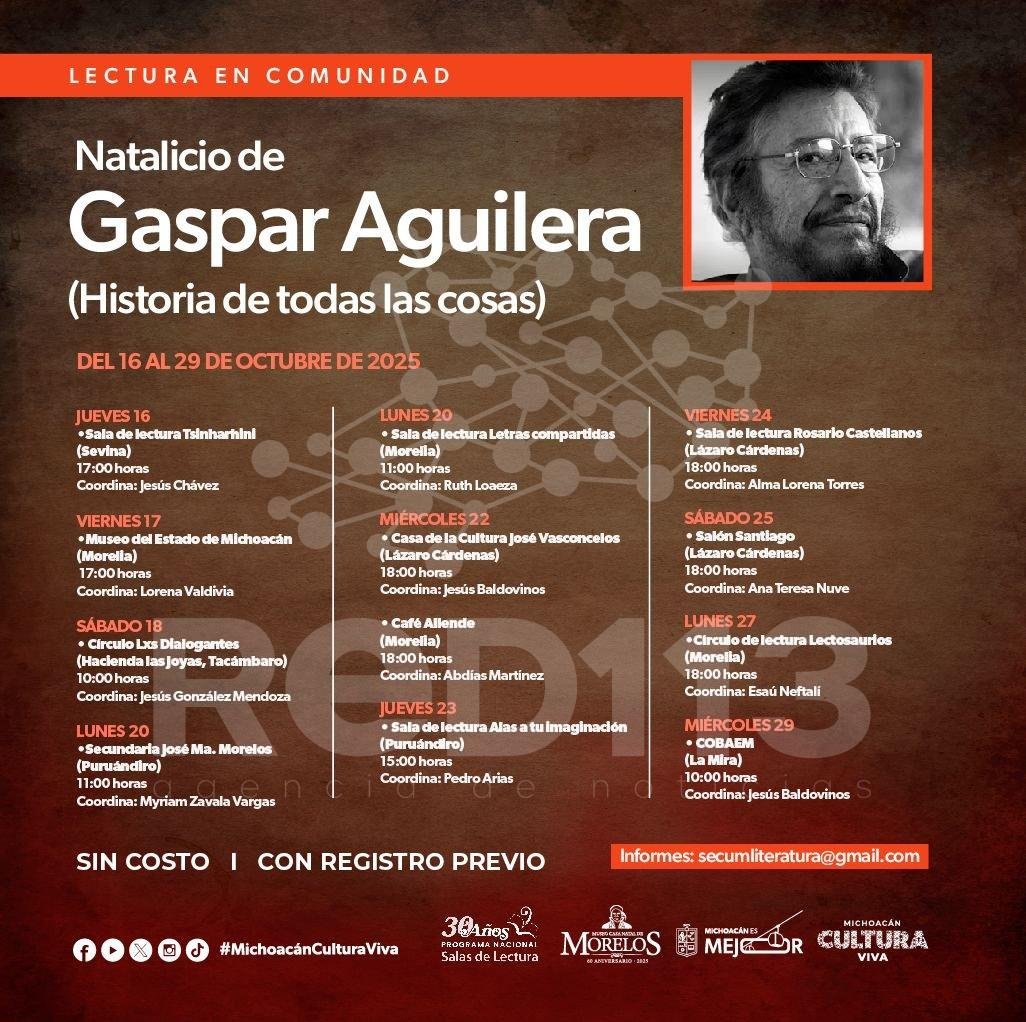Morelia, Michoacán, 14 de octubre de 2025.- La Secretaría de Cultura de Michoacán (Secum), junto con voluntarias y voluntarios del Programa Nacional Salas de Lectura, conmemorarán el natalicio del poeta y narrador Gaspar Aguilera, nacido el 20 de octubre de 1947, con una jornada estatal de lectura colectiva que se realizará del 16 al 29 de octubre.