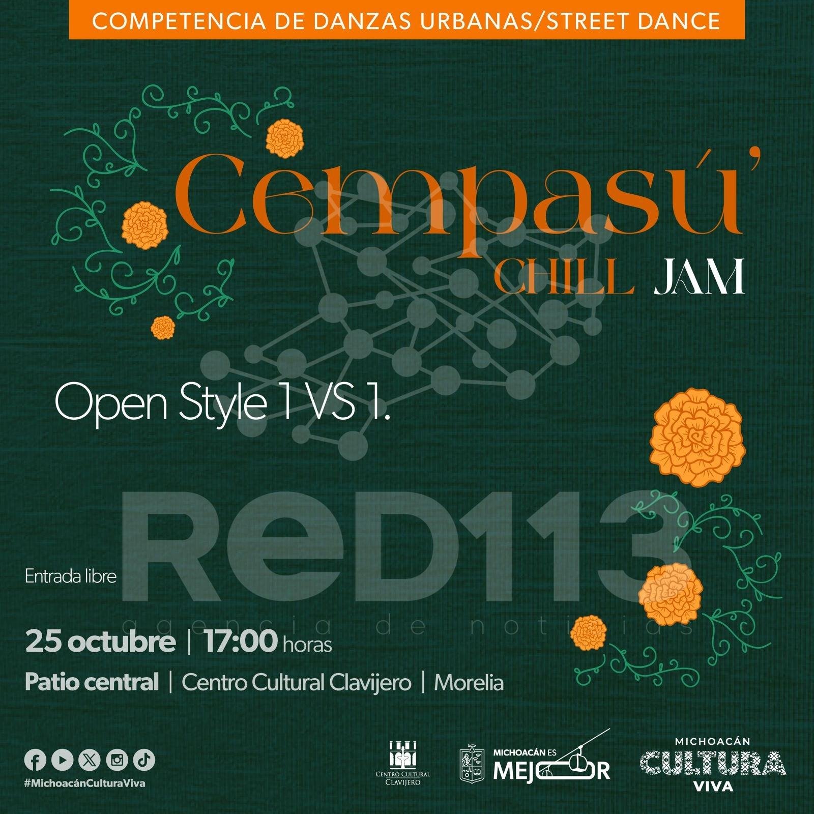 Morelia, Michoacán, 22 de octubre de 2025.- La Secretaría de Cultura de Michoacán (Secum) invita a todas y todos los amantes del baile a participar en el Cempasú´Chill Jam 2025, un encuentro que celebra la danza urbana, la creatividad y el talento joven. La cita es este sábado 25 de octubre a las 17:00 horas en el segundo patio del Centro Cultural Clavijero con entrada libre.