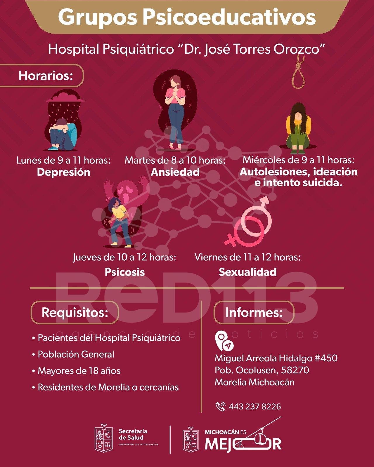 Morelia, Michoacán, 17 de abril de 2026.- La Secretaría de Salud de Michoacán (SSM), a través del Hospital Psiquiátrico “Dr. José Torres Orozco” de Morelia, invita a la ciudadanía a participar en sus Grupos Psicoeducativos, con el objetivo de brindar herramientas prácticas para el manejo de trastornos mentales.