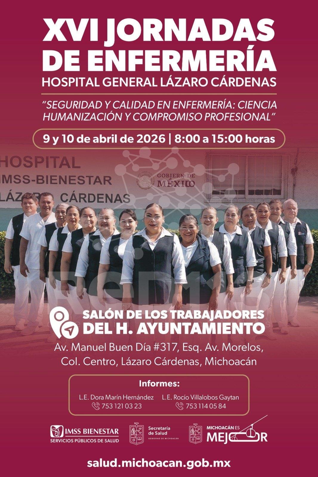 Morelia, Michoacán, 7 de abril de 2026.- Para fortalecer la cultura de la seguridad y calidad en el servicio, el Hospital General de Lázaro Cárdenas, de la Secretaría de Salud de Michoacán (SSM), llevará a cabo las 16 Jornadas de Enfermería, los próximos 9 y 10 de abril.