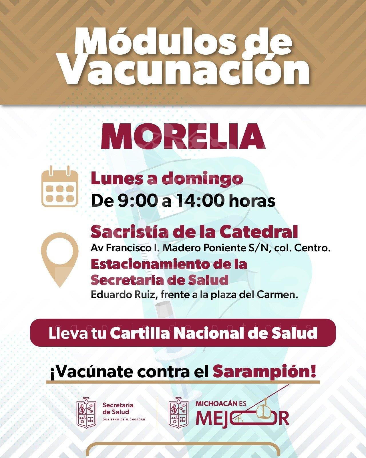Los módulos se encuentran en la Sacristía de la Catedral de Morelia y en el estacionamiento de la SSM, ubicado en la calle Eduardo Ruiz, frente a la plaza del Carmen. En ambos módulos existe abasto suficiente de vacunas para todas las edades, priorizando las de influenza, COVID-19, neumococo y sarampión. Además, brinda atención de lunes a domingo, de 9:00 a 14:00 horas.