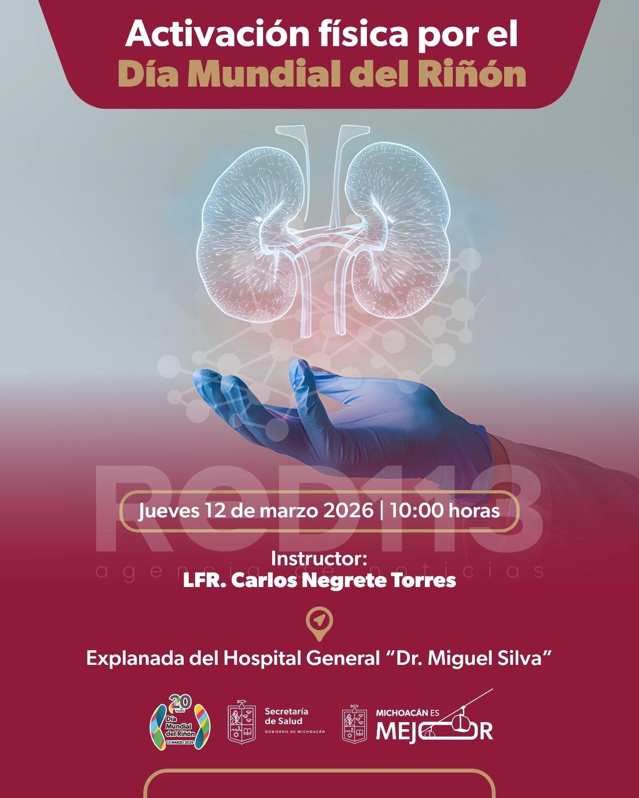 Morelia, Michoacán, 9 de marzo de 2026.- La Secretaría de Salud de Michoacán (SSM) invita a la población general y al personal de salud a participar en la Jornada de Activación Física por el Día Mundial del Riñón, como parte de las acciones para fomentar estilos de vida saludables y prevenir enfermedades crónico-degenerativas.