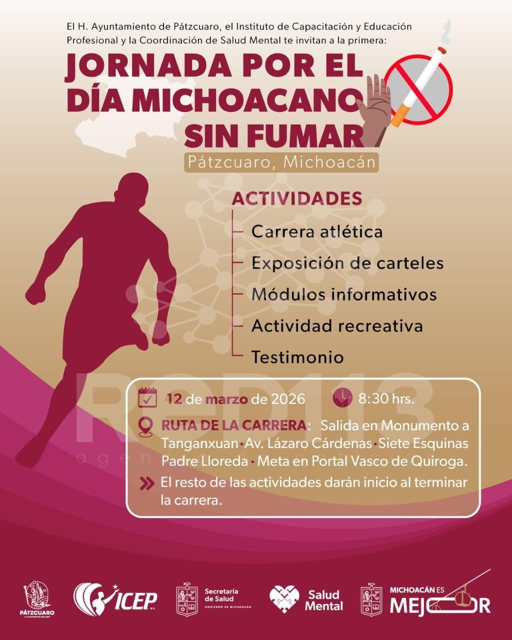 Pátzcuaro, Michoacán, 10 de marzo de 2026.- Con el objetivo de fomentar entornos libres de humo y proteger la salud juvenil, la Secretaría de Salud de Michoacán (SSM), a través de la Coordinación de Salud Mental, llevará a cabo una carrera atlética. Esta actividad forma parte de la jornada integral por el Día Michoacano sin Fumar, realizada en coordinación con el Ayuntamiento de Pátzcuaro y el Instituto de Capacitación y Educación Profesional (ICEP).