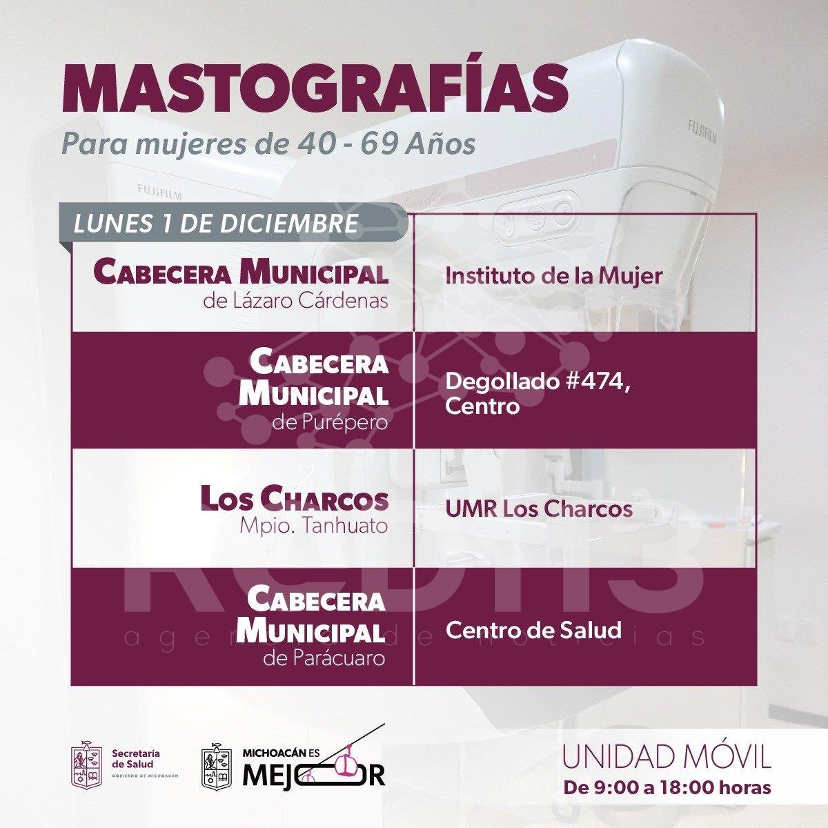 Morelia, Michoacán, 29 de noviembre de 2025.- Durante diciembre, la Secretaría de Salud de Michoacán (SSM) continúa con las acciones de detección oportuna del cáncer de mama en mujeres de 40 a 69 años, con el despliegue de unidades móviles de mastografía en 10 municipios del estado.