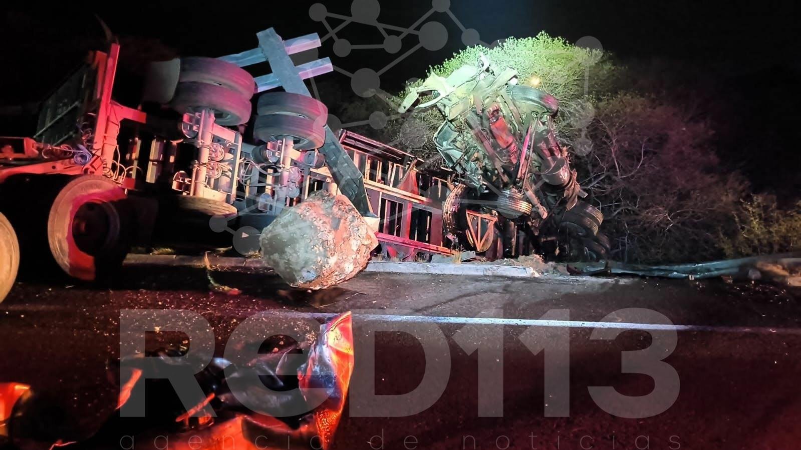 La unidad involucrada corresponde a un tractocamión doble articulado con contenedores, marca Kenworth T660, modelo 2011, color blanco, con placas 53-BK-13 del Servicio Público Federal, el cual terminó fuera de la carpeta asfáltica.