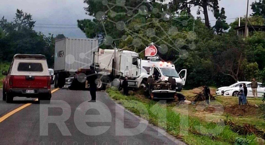 El tráiler, uno de color blanco quedó atravesado sobre la vialidad, mientras que la camioneta tipo pick-up, de color verde, se proyectó a un costado de carpeta asfáltica, donde quedó con las llantas hacia el cielo.