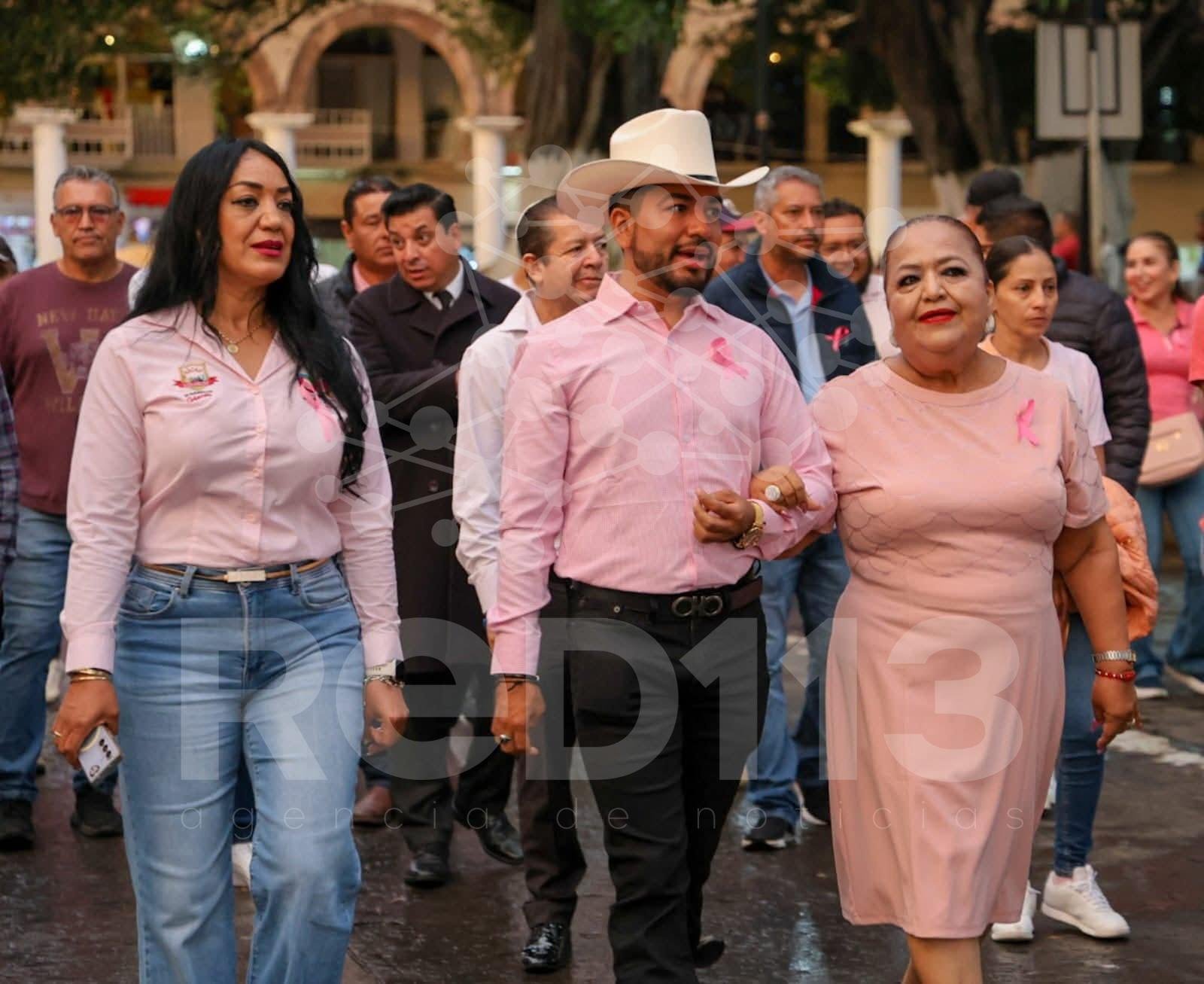 Acompañado de su madre, Evangelina Solís, presidenta honoraria del DIF, así como de la asesora honorífica, directores y personal del organismo, el alcalde participó en la Marcha Rosa, donde expresó su reconocimiento a las mujeres reyenses por su fortaleza y amor incondicional.