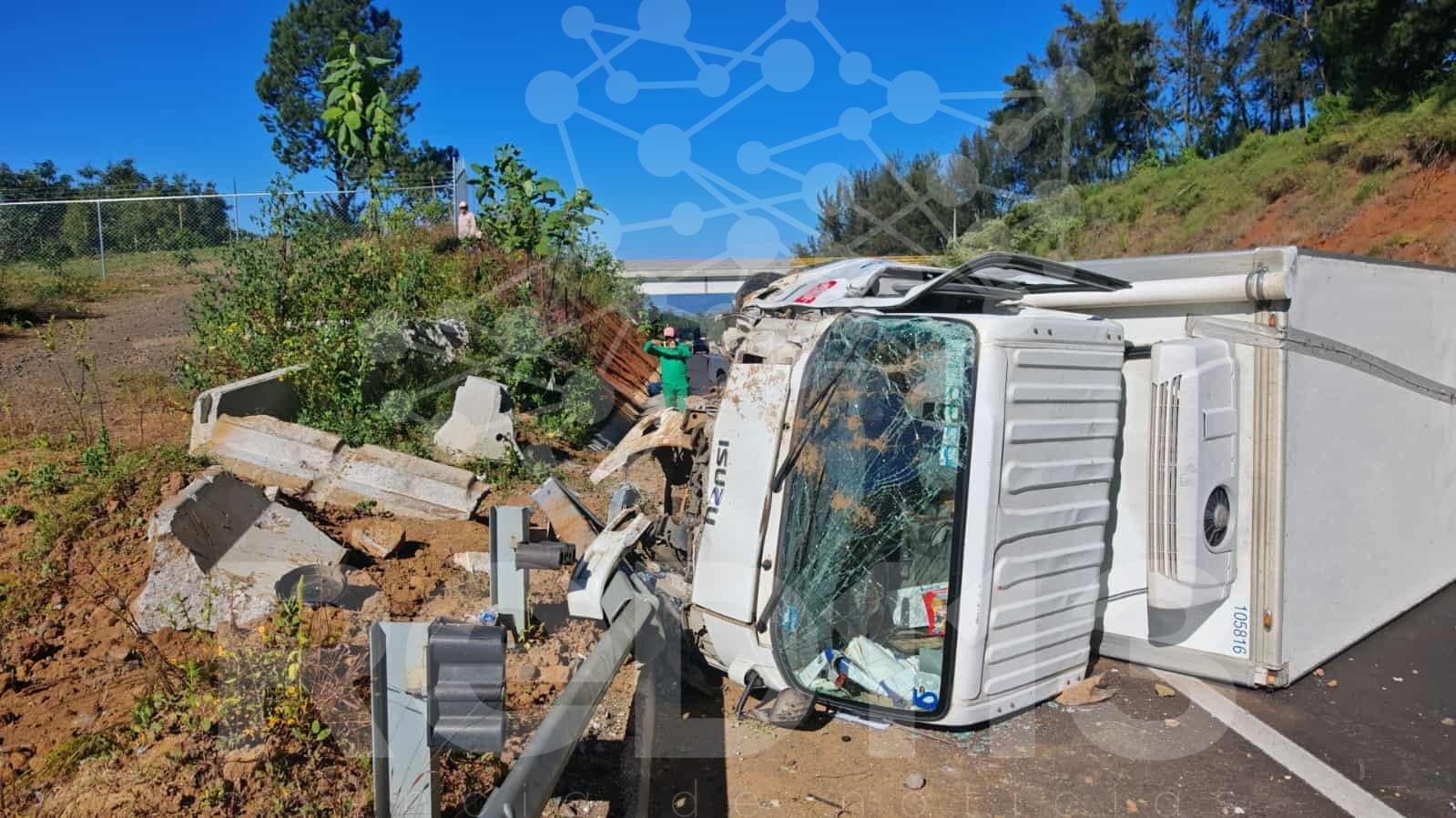 Salvador Escalante, Mich.- 29 de octubre de 2025.- Un camión repartidor de la empresa LALA protagonizó la mañana de este miércoles una volcadura sobre la Autopista Siglo XXI, en el tramo Pátzcuaro-Uruapan, lo que generó la movilización de los cuerpos de auxilio y de seguridad.