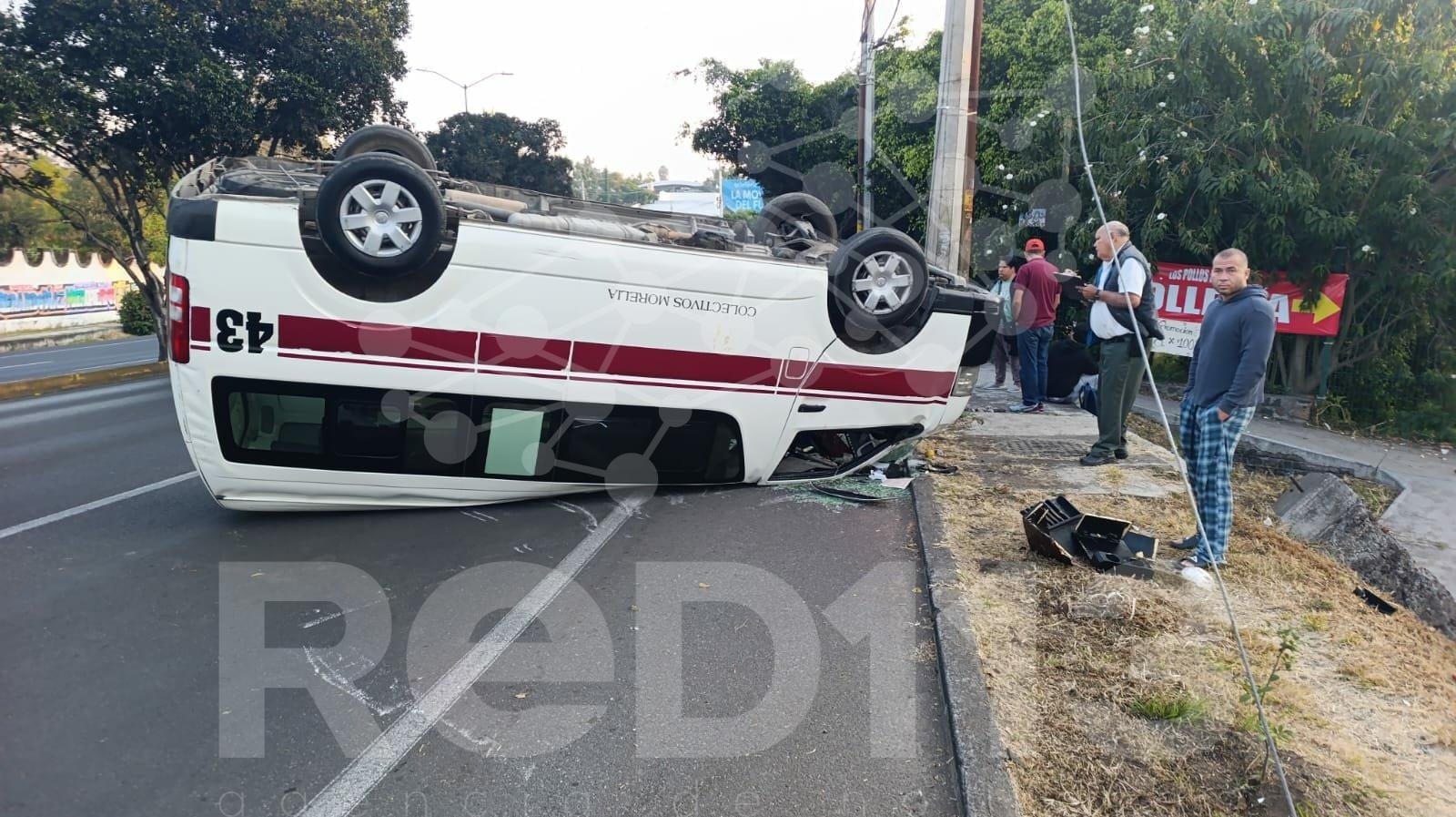 El aparatoso incidente se registró en el sentido de Fuentes de Morelia hacia Casa Michoacán, donde terminó volcada una camioneta de la Ruta Guinda, con número económico 43.