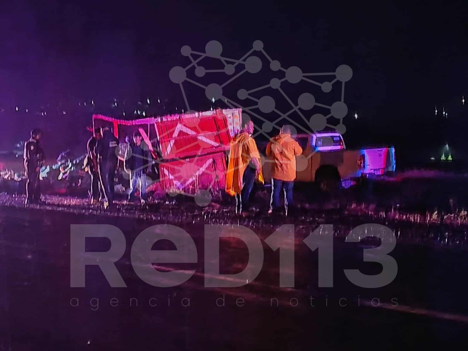 Morelia, Mich.- Jueves 11 de septiembre de 2025.- Un tractocamión que transportaba varias arpillas de limones volcó sobre la carretera Morelia-Pátzcuaro, consecutivamente una camioneta Nissan NP300 se estrelló contra la retaguardia de la mencionada unidad siniestrada, hecho que dejó dos heridos leves y daños materiales, comentaron fuentes policiales y de rescate.